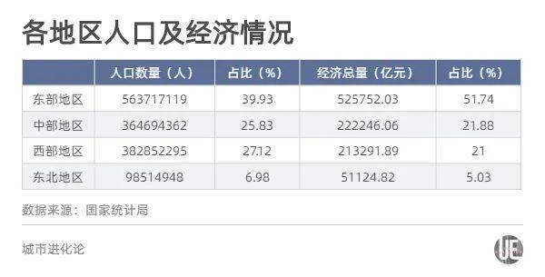 根据第七次人口普查数据,东部地区以占全国约40%的常住人口总量贡献了51.74%的GDP,而中部、西部和东北地区均表现为人口占比大于经济占比。