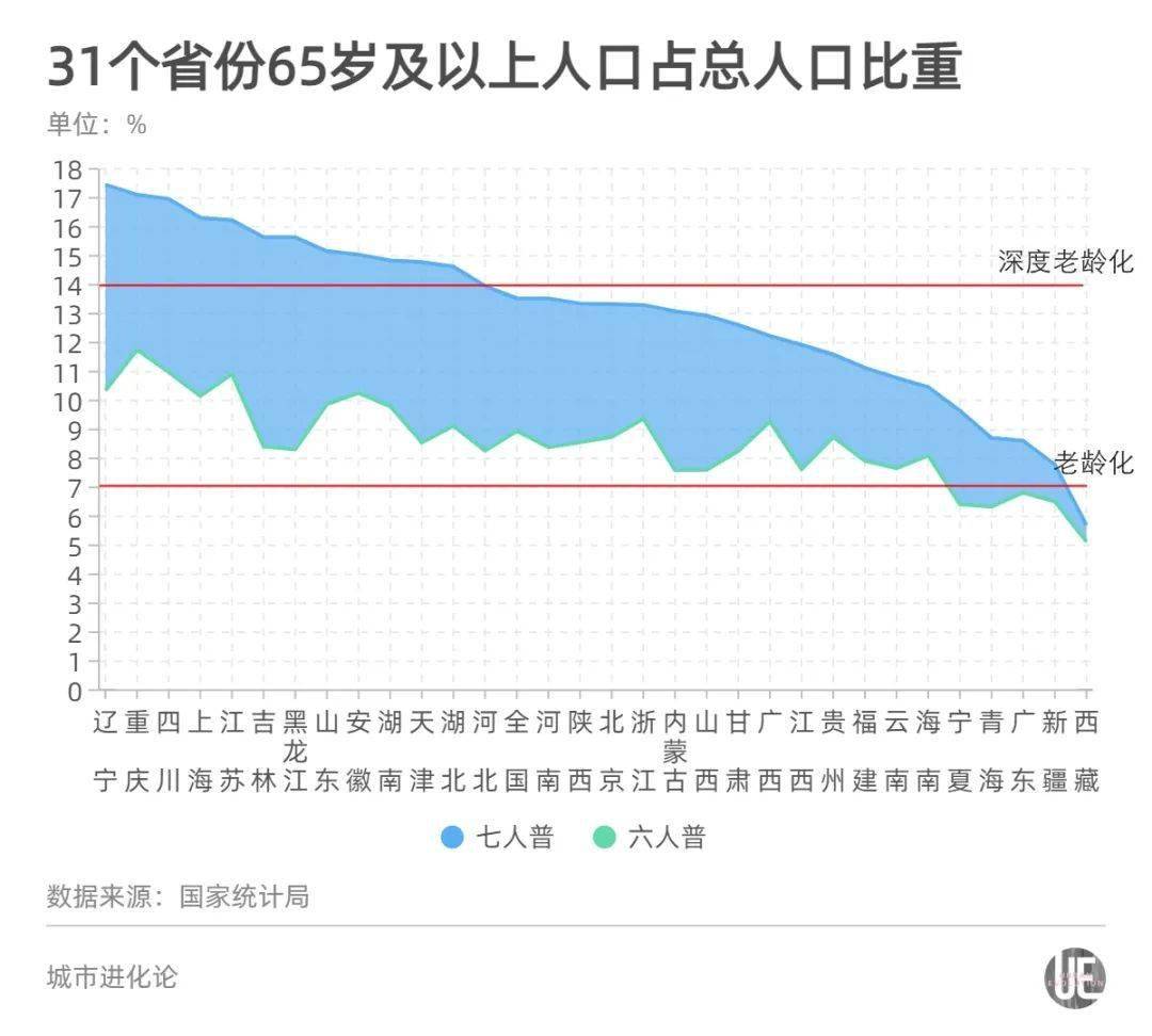 而到2020年,除西藏以外,其余30个省份均已进入老龄化,辽宁、重庆、四川、上海、江苏、吉林、黑龙江、山东、安徽、湖南、天津及湖北等12个省份,更是在过去10年间集体迈入深度老龄化。