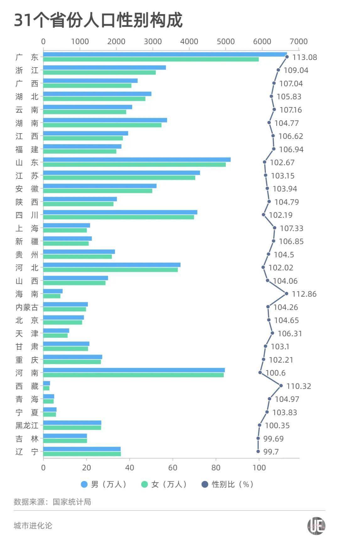 具体在31个省份中,总人口性别比在100以下的省份有2个,在100至105之间的省份有17个,在105至110之间的省份有9个,在110以上的省份有3个。广东、浙江男女数量差距最大,其中广东男性比女性多773万人。