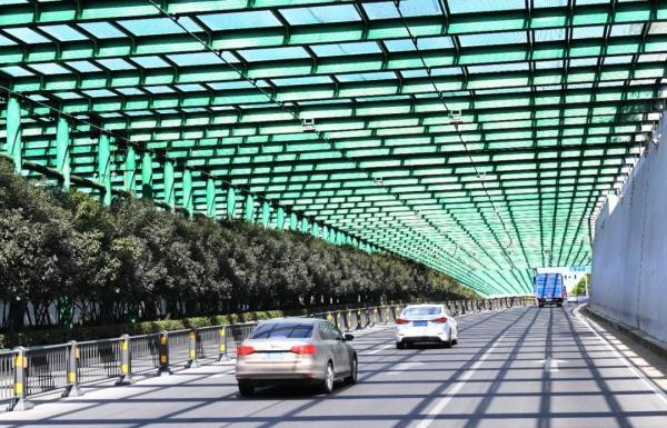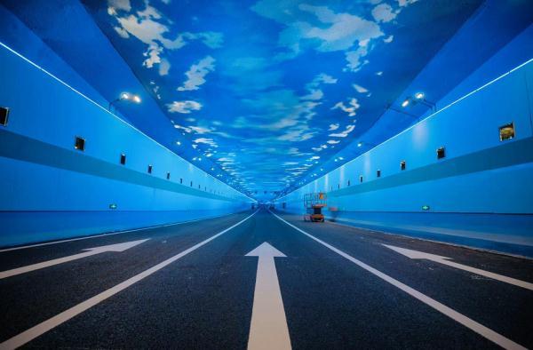 项目全线共有五大重要节点性工程,其中备受关注的庐州大道地下隧道工程目前已基本建成。记者进入隧道提前一览风景,见到整条隧道以蓝色为主基调,车子行驶在隧道里宛如在蔚蓝的海底遨游,双向六车道的道路笔直宽阔。在隧道中间顶部位置,有一段采取动态投影设计,通过画面展示和变化,可以体现合肥美丽风景和科创特色。
