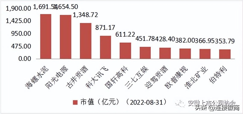 截至8月31日, 安徽辖区A股上市公司的总市值为19131.21亿元,占A股上市公司总市值的2.13%。市值排名前十公司依次为海螺水泥、阳光电源、古井贡酒、科大讯飞、国轩高科、三七互娱、迎驾贡酒、欧普康视、淮北矿业、伯特利。