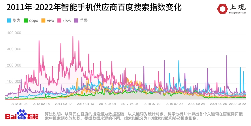 在百度指数中, 2011年以来五大供应商的搜索频次,都呈现了下降趋势,而其中小米的下降可能是最明显的。
