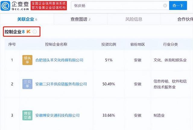 企查查APP显示,“疯狂小杨哥”张庆杨目前控制企业有8家,间接持股企业10家,并在其中5家担任法定代表人,包括合肥三只羊创业投资有限公司、合肥三只羊网络科技有限公司、合肥领头羊文化传媒有限公司等,商业版图涉及文化传媒、直播电商、创业投资、供应链管理、交通设施等。
