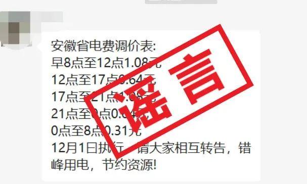 市民王女士反映,在自己的微信群里有看到有人在转发消息称:“12月1日起电费调价,早8点至12点1.08元,12点至17点0.64元,17点至21点1.08元,21点至0.64元,零点至早上8点0.31元。安徽12月1日执行,请大家互相转告,错峰用电,节约资源。”