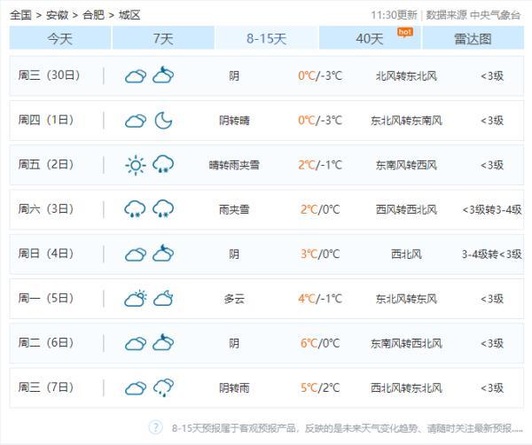 “合肥是不是要下雪了?”此前,一些市民从8~15天预报看到合肥即将降雪的消息,不过记者从气象部门获悉,8~15天的预报,是集合多家全球数值天气预报模式客观预报产品加工而成,未经预报员主观订正,反映未来一段时间内天气变化趋势,具有一定的不确定性,仅供公众参考。