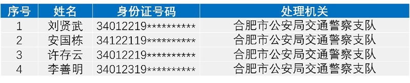 中安在线、中安新闻客户端讯为有效预防和减少道路交通事故,营造平安畅通的道路交通环境,合肥市公安局交警支队向社会公布全市2022年11月份终生禁驾人员名单、非现场处罚违法车辆TOP10。