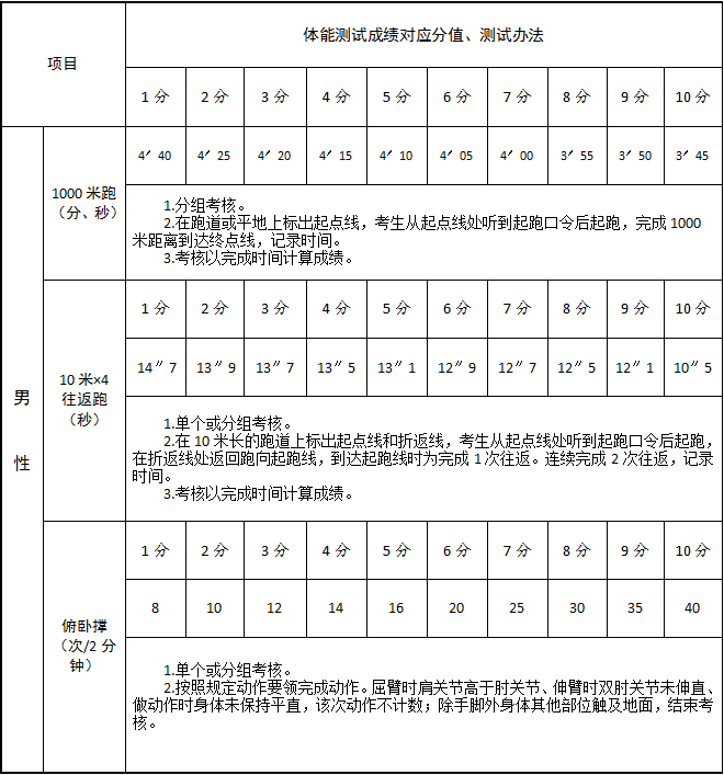 1、体技能测试:主要考察应聘者是否具有正常履职的身体条件。考核项目:1000米跑、俯卧撑、10米×4往返跑3个项目,具体标准(详见下图);驾驶员岗位增加车辆驾驶技能测试。