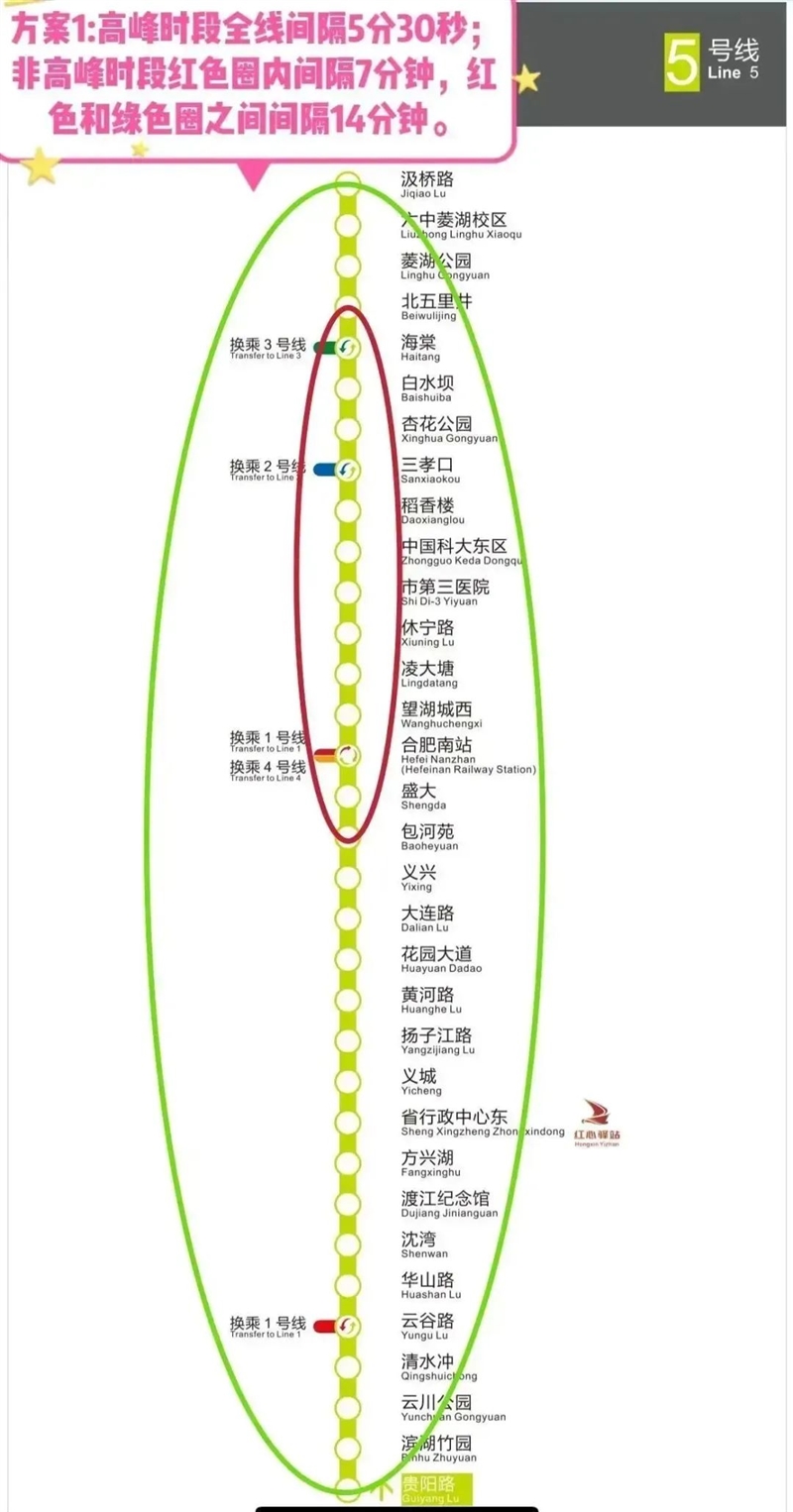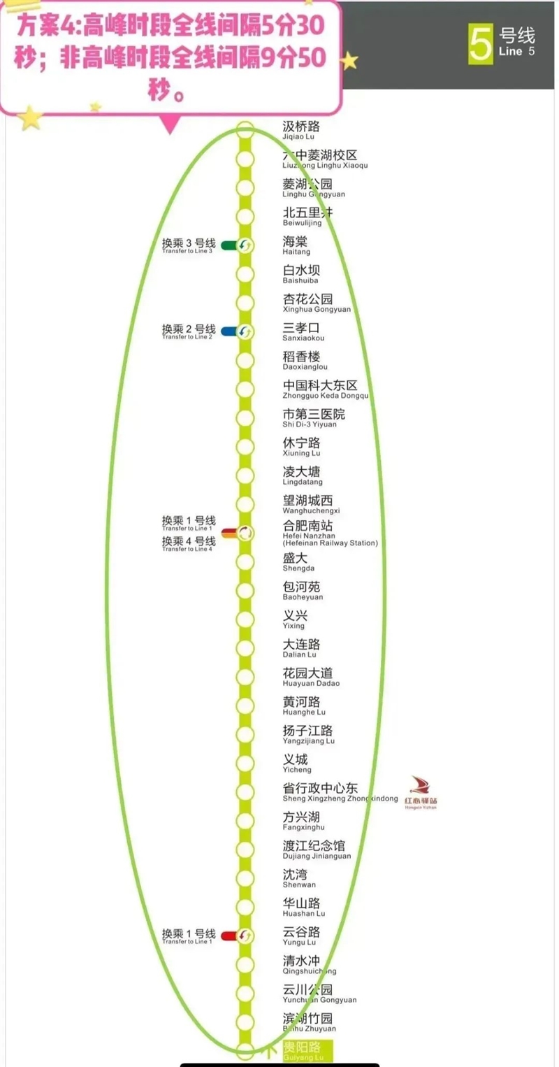 (执行此方案,方便全线市民乘客高峰期乘车,非高峰期时段包河苑站至北五里井站行车间隔压缩到最小,贵阳路站至包河苑站、北五里井站至汲桥路站的市民出行需耐心等待。)