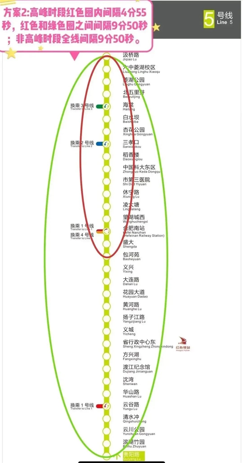 (执行此方案,高峰时段包河苑站至汲桥路站行车间隔压缩到最短,贵阳路站至包河苑站乘客高峰期出行需耐心等待。)