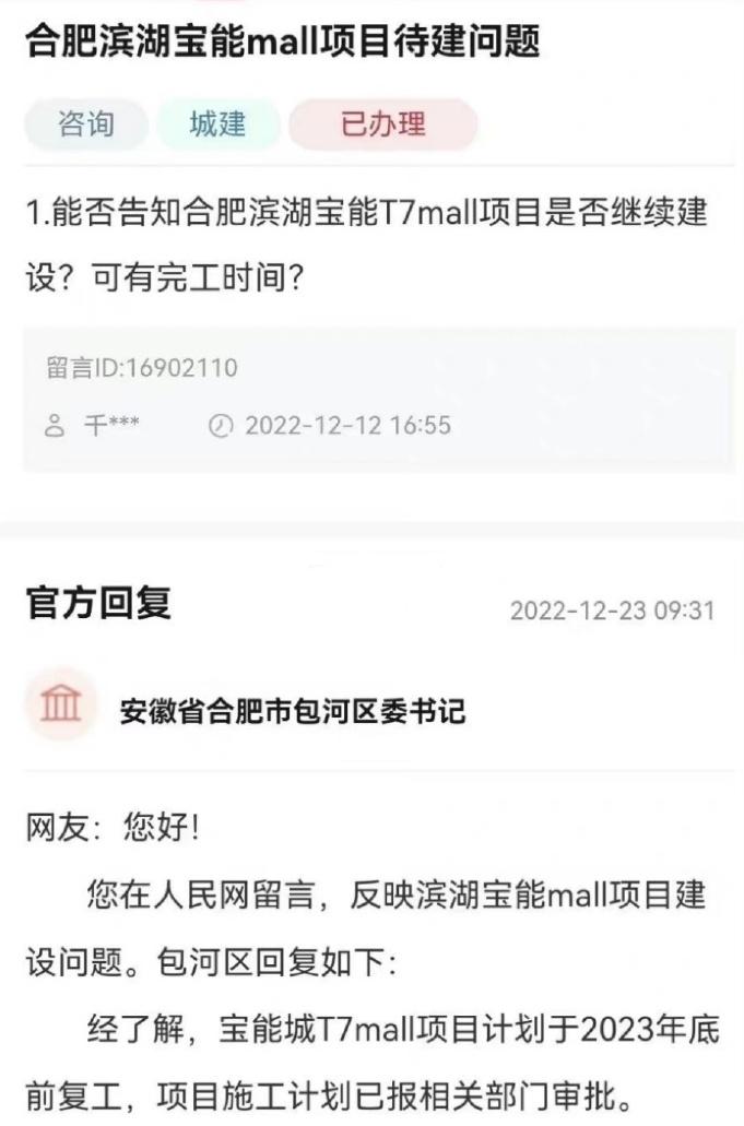 在2022年12月23日,安徽省合肥市包河区委书记曾在人民网回复关于宝能城项目是否继续建设时表示,宝能城T7&MALL项目计划在2023年底前复工,项目施工计划已报相关部门审批。
