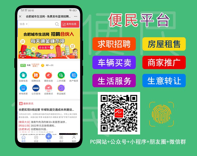 合肥城市生活网唯一官方微信公众号“霸都城市生活网”,关注可免费发布求职招聘、房产租售、车辆买卖、便民信息等24小时在线客服微信:athd365 &