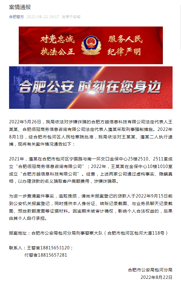 2022年5月26日,合肥市公安局包河分局依法对涉嫌诈骗的合肥方越信息科技有限公司法定代表人王某某、合肥佰冠商务信息咨询有限公司法定代表人潘某采取刑事强制措施。2022年8月1日,经合肥市包河区人民检察院批准,合肥市公安局包河分局依法对王某某、潘某二人执行逮捕,现将有关案件情况通告如下: