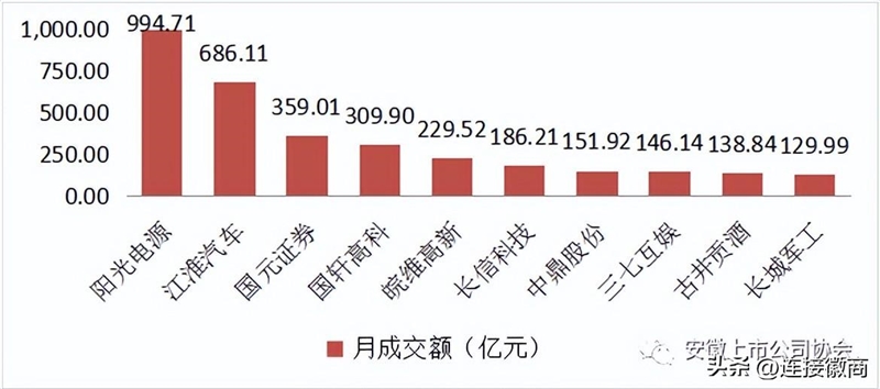 月成交额排名前十的上市公司依次为阳光电源、江淮汽车、国元证券、国轩高科、皖维高新、中鼎股份、三七互娱、古井贡酒、长城军工。