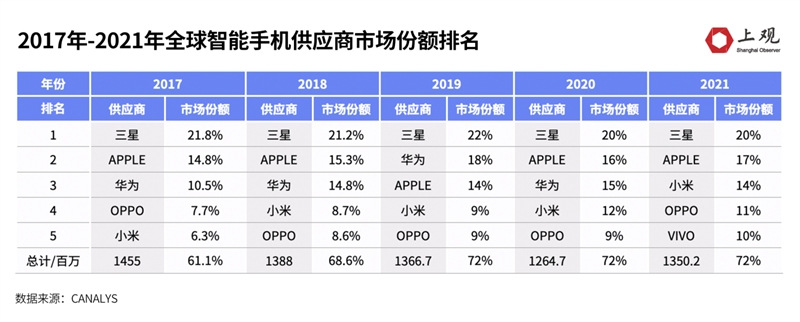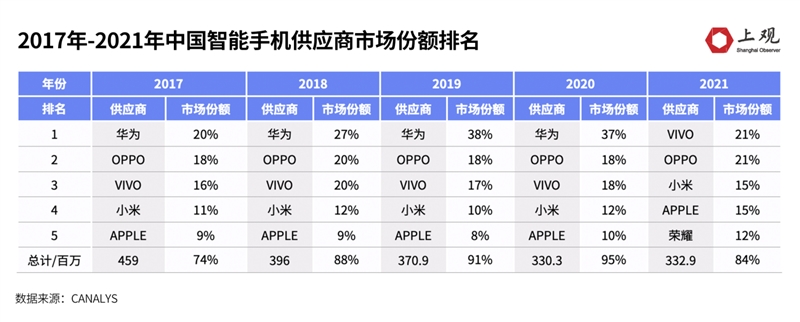 从市场份额看,中国智能手机供应商版图好多年不变了,前五大供应商的排名也几乎未动。并且五大供应商总体的市场份额,已经从2017年的74%增至2021年的84%,在2019、2020年则突破了90%。
