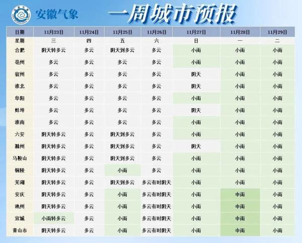 据安徽省气象台最新预报,预计23日至26日我省江北以多云天气为主;沿江江南多云到阴天,其中23日江南中东部、24日夜里至25日沿江江南部分地区有小雨。27日开始我省还有一次降水过程。此外,明天早晨淮北地区、大别山区和江南有雾。