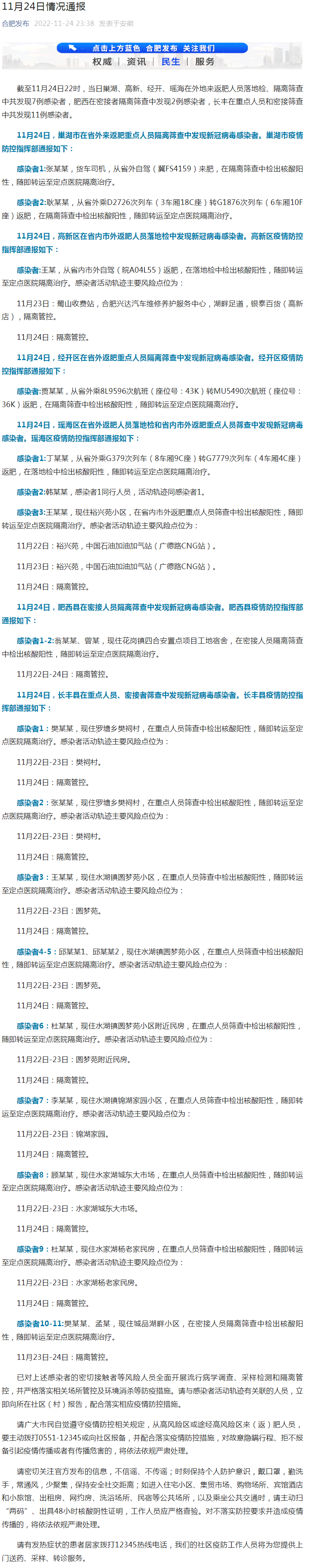 截至11月24日22时,当日巢湖、高新、经开、瑶海在外地来返肥人员落地检、隔离筛查中共发现7例感染者,肥西在密接者隔离筛查中发现2例感染者,长丰在重点人员和密接筛查中共发现11例感染者。