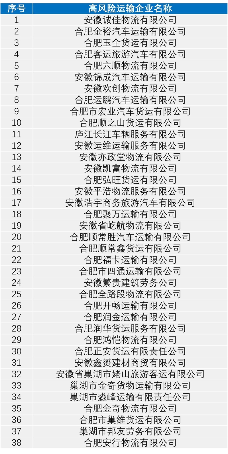为深入推进道路交通事故预防“减量控大”工作,公安部交通管理局根据机动车和驾驶人相关指标,确定了一批交通安全高风险运输企业。现对2022年11月份涉及合肥市交通安全高风险的运输企业予以曝光,督促相关企业落实主体责任,尽快消除交通安全风险隐患,保障道路通行安全。