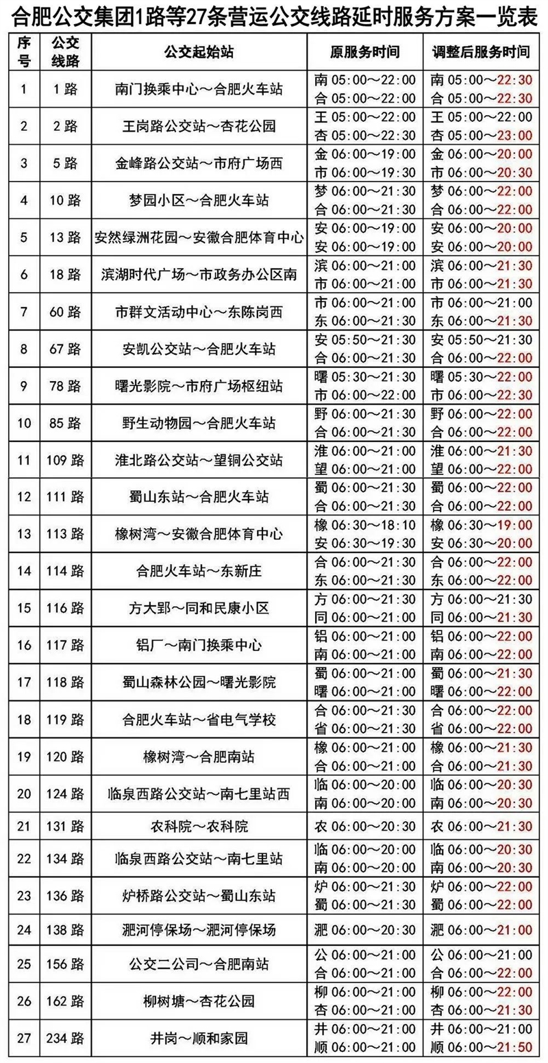 新春佳节将至,公交客流晚高峰相对延后。自2023年1月12日起,合肥公交延长1路、2路、5路、10路、13路、18路、60路、67路、78路、85路、109路、111路、113路、114路、116路、117路、118路、119路、120路、124路、131路、134路、136路、138路、156路、162路、234路等27条公交线路服务时间,更好地满足市民夜间乘坐公交车出行需求。