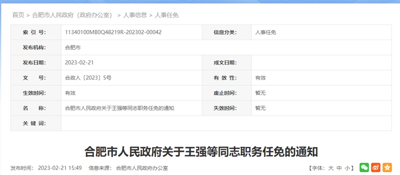 大皖新闻讯 近日,合肥市人民政府发布通知,任免一批干部。
