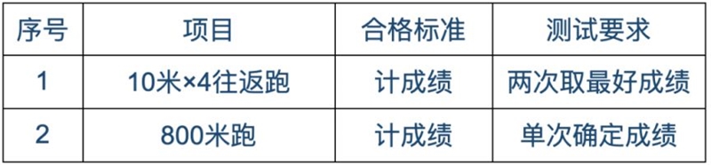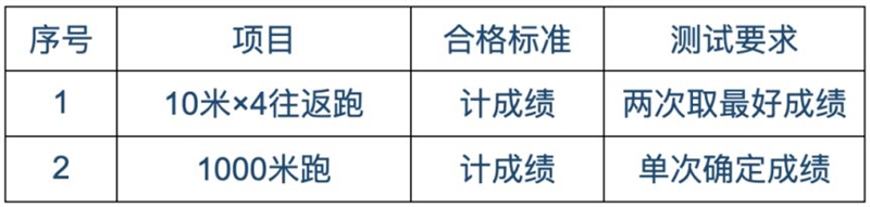 3.体能测试共设2个项目,分别为10米×4往返跑、1000米跑(女800米跑)。10米×4往返跑测评次数为2次(取最高成绩记入)、1000米跑(女800米跑)测评次数为1次。