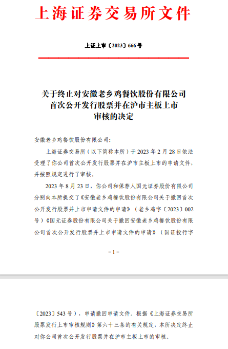 8月29日,上交所日前公布的《关于终止对安徽老乡鸡餐饮股份有限公司首次公开发行股票并在沪市主板上市审核的决定》(简称“决定”)显示,安徽老乡鸡餐饮股份有限公司(简称“老乡鸡”)主板IPO(首次公开募股)审核已终止。