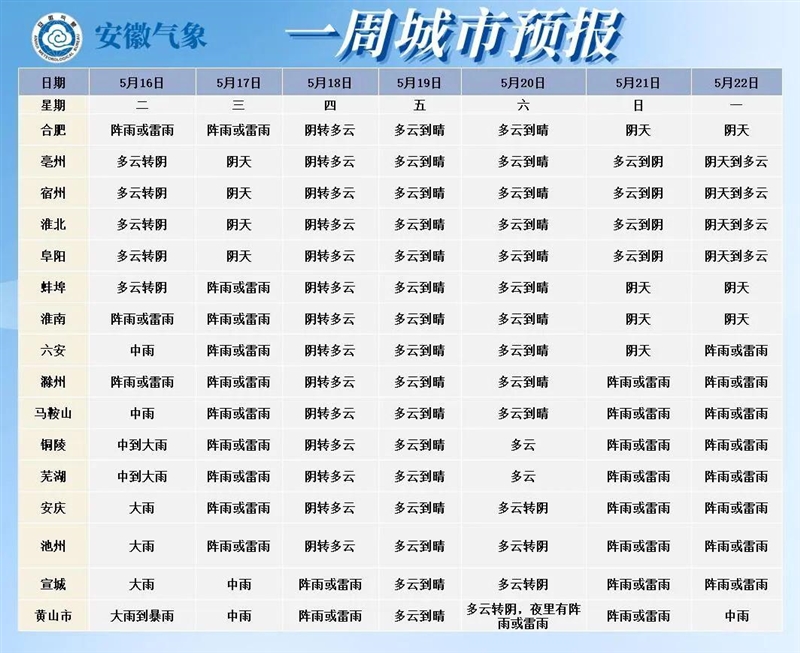 据安徽气象消息,今天傍晚至明天淮河以南有较明显降水过程,雷雨时阵风7级并伴有短时强降水(20~40毫米/小时)等强对流天气,其中今天江淮之间南部和江南部分地区有大雨到暴雨。21日前后我省南部还有一次弱