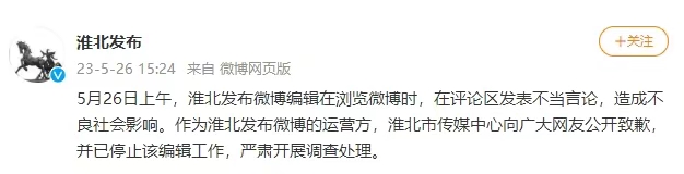 5月26日上午,淮北发布微博编辑在浏览微博时,在评论区发表不当言论,造成不良社会影响。作为淮北发布微博的运营方,淮北市传媒中心向广大网友公开致歉,并已停止该编辑工作,严肃开展调查处理。