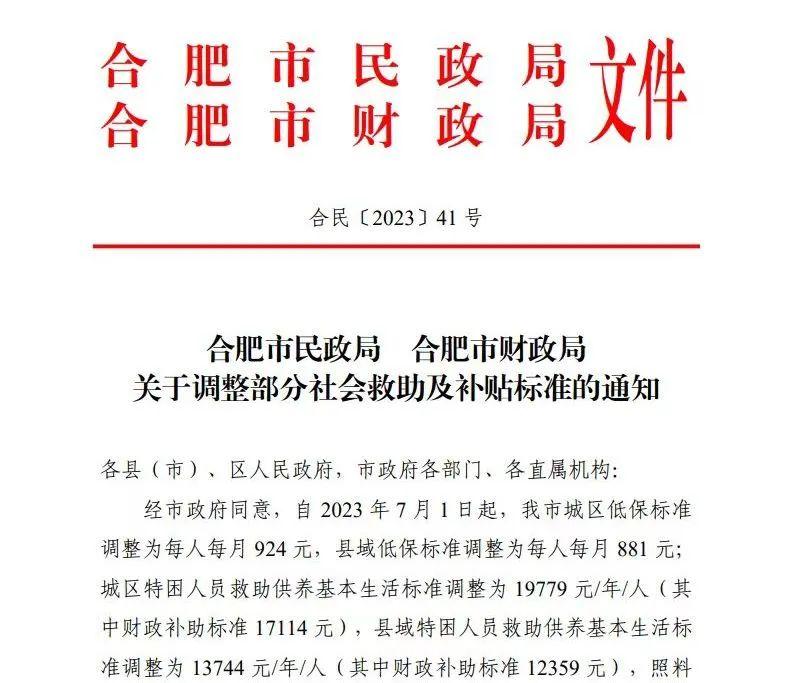 据合肥民政微信号6月7日消息,近日,合肥市民政局、市财政局联合印发《关于调整部分社会救助及补贴标准的通知》(以下简称《通知》),决定自2023年7月1日起,提高全市城乡低保等部分社会救助及补贴标准,此